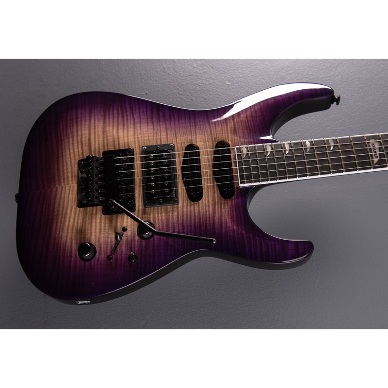 Royal Purple Perimeter, Mahogany body with AAA Figured Maple veneer, bound 12″ radius Ebony fingerboard withKramer Mini Headstock inlays on a Kramer K-Speed SlimTaper C shapedMahogany neck, 25.5″ scale length, 1.693″ nut width,Seymour Duncan JB bridge and Seymour Duncan Cool Rails neck and middle pickups with 5 way switching, Master Volume and Tone controls with bridge pickup coil tap mini toggle, Floyd Rose 1000 series Tremolo,Kramer Black Die Cast tuners, 7.0 pounds, case not included.