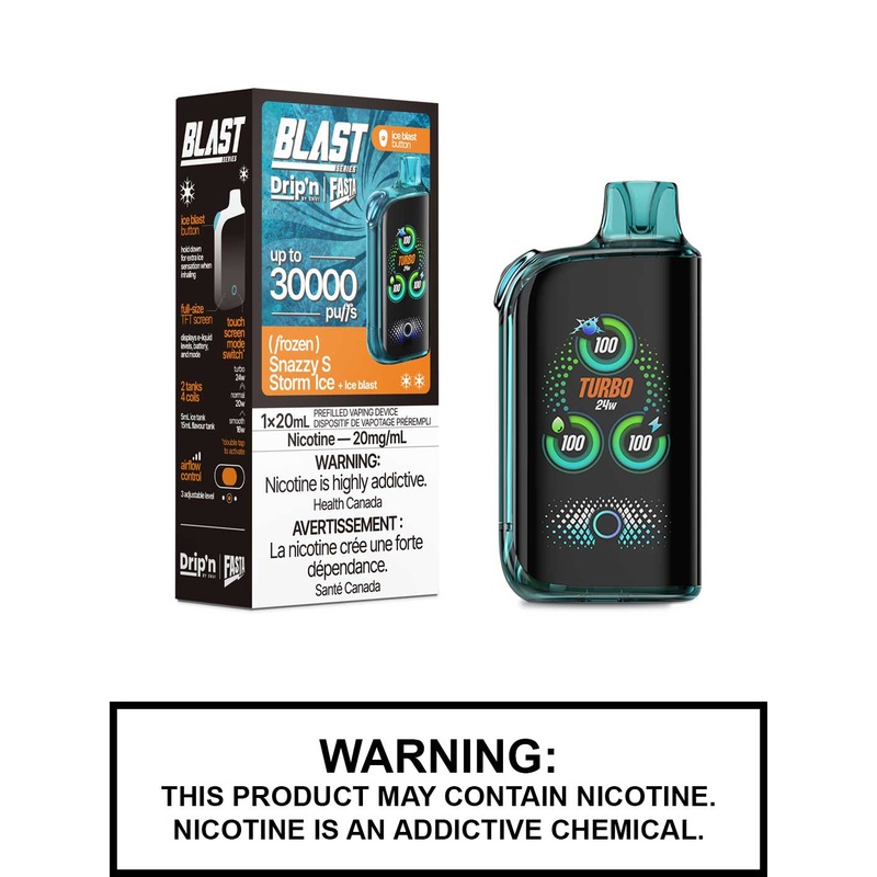Introducing the Snazzy S Storm Ice Dripn Blast 30K Disposable Vape, a powerhouse collaboration between Dripn and Fasta, delivering up to 30,000 puffs with 20mL of vape juice. This innovative vape boasts dual tanks: a 15mL flavour tank and a 5mL ice tank, allowing you to personalize your flavour and ice experience with every puff. Activate the Blast Button for an extra icy sensation when inhaling, giving you more control over intensity.