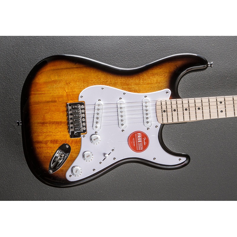 “The Squier Sonic Stratocaster is ready to launch any musical adventure into warp speed, offering iconic Fender style and inspiring tone for players at any stage. This Strat sports a slim and inviting C-shaped neck profile and a thin, lightweight body for optimal playing comfort while a trio of Squier single-coil pickups chime with crystal clarity for a wide variety of versatile tones. Further details of this model include a tremolo bridge for expressive vibrato effects, sealed-gear tuning machines for smooth, accurate tuning and durable chrome-plated hardware that is sure to catch the spotlight.”