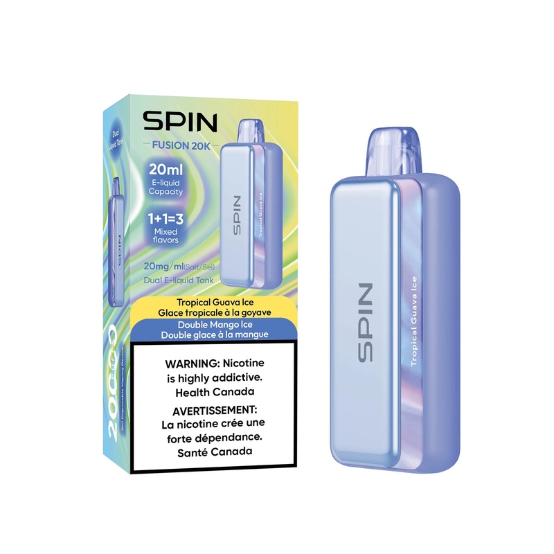 The Spin Fusion 20K - Tropical Guava Ice and Double Mango Ice- Experience the refreshing combination of Tropical Guava Ice and Double Mango Ice Features: 3 in 1 flavours: Spin Fusion 20K Puff Count: Up to 20000 Puffs Coil:DUAL Mesh Coil Dual airway technol
