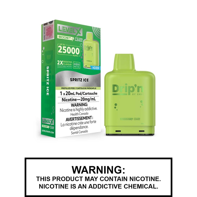 Introducing the Spritz Ice Drip'n Level X Boost G2 Pods, the latest innovation in the Level X family. These pods feature an impressive 20mL capacity, delivering up to 25,000 puffs and setting a new benchmark for Level X pods. Compatible with the Level X Bo