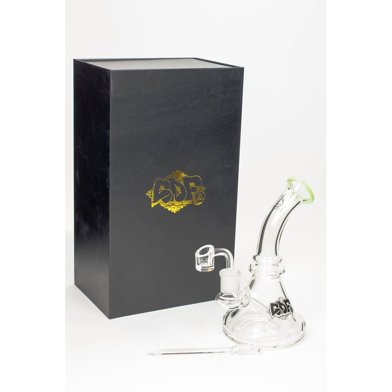The Bong Premium Pyramide Squadafum is short but imposing! It is made of 5mm thick borosilicateGlass and has a percolator attached to the downstem. It comes with a high-quality Quartz nail and a dabber, which configures greater heat resistance. Due to its