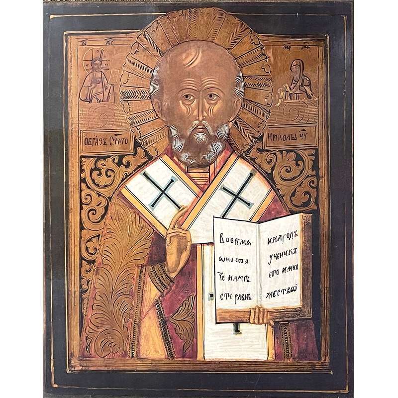 Painting reproduction of St. Nicholas icon, plaque mounted on wood, 3/8 in thick. Laminated. 11×14 inches.