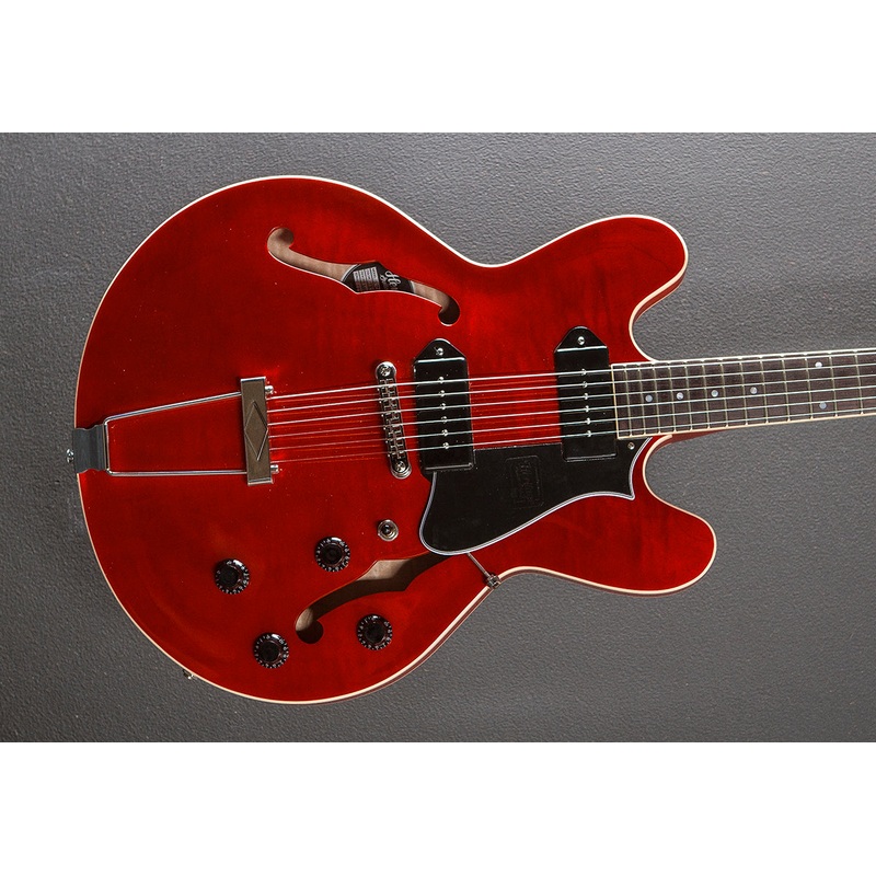 Translucent Cherry,Gloss nitrocellulose lacquer finish, Hollow body, Laminated Curly Maple top and back with the solid Curly Maple rim, Cream binding, Standard shaped Mahogany neck, Bound 12 radius Rosewood fingerboard with the Pearl Dot inlays and medium jumbo frets, 24.75 scale length, 1 11/16th” nut width, .75″ to .85″ neck depth, Lollar Dogear P-90 bridge and neck pickups, 3-way toggle switching with the volume and tone controls for each pickup, Locking tune-o-matic bridge and trapeze tailpiece, Heritage cast/sealed tuners, 6.6 pounds, With hardshell case