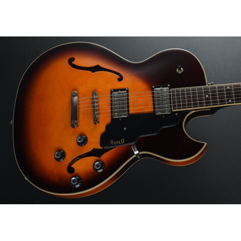 Very Good Condition, Antique Burst Gloss Polyurethane Finish, Semi-Hollowbody With Center Block For Bridge Stability And Reduced Feedback, Laminated Maple Top/Sides/Back, Unbound F-Holes, Set-In Mahogany Neck With Modern Thin U Profile, 24.75″ Scale Length, 1 11/16″ Nut Width, Indian Rosewood Fingerboard With 12.5″ Radius And Pearloid Dot Inlays, 20 Narrow-Tall Frets, Nickel Hardware, Guild Tune-O-Matic Bridge And Stop-Bar Tailpiece, Guild Vintage-18 Open-Gear Tuners, Two Guild HB-2 Humbuckers With Push-Pull Coil Split On Volume And Tone Knobs, 3-Way Toggle Pickup Selector, 6.7lbs., Comes with Original Hardshell Case.