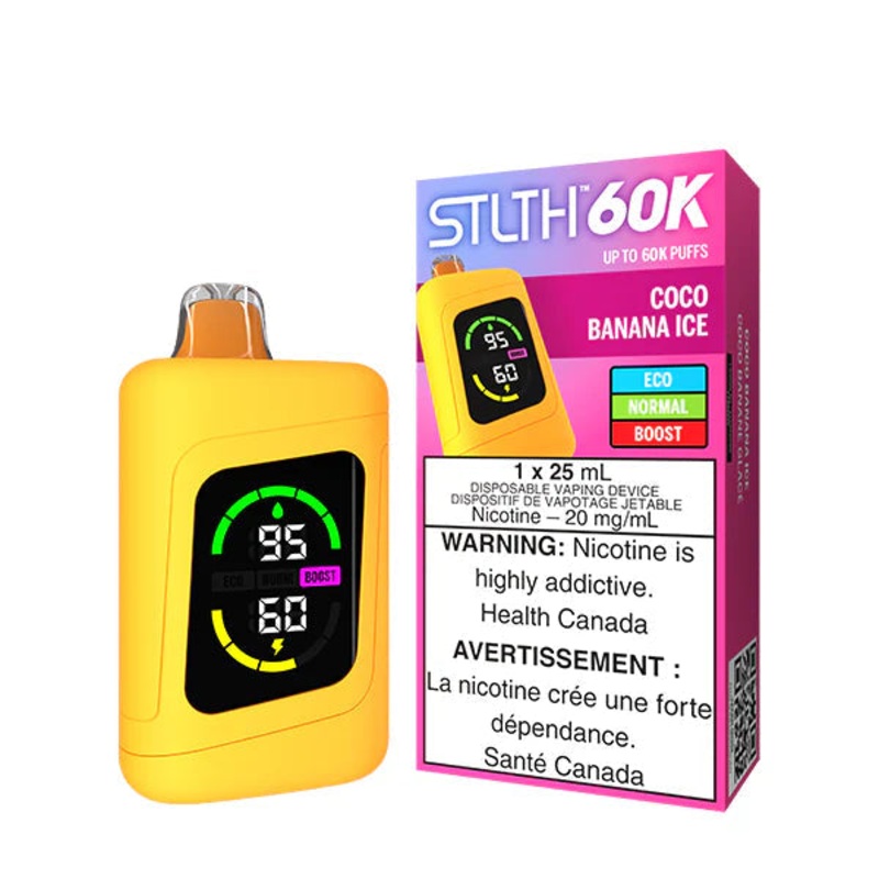 STLTH 60k - Coco Banana Ice- A creamy blend of ripe banana and coconut with a refreshing icy finish. Key Features: STLTH 60K - 3 Modes: ECO / NORMAL / BOOST Adjustable Airflow Rechargeable Battery Type-C Charger Mega Screen E-Liquid & Battery Indicator Spe
