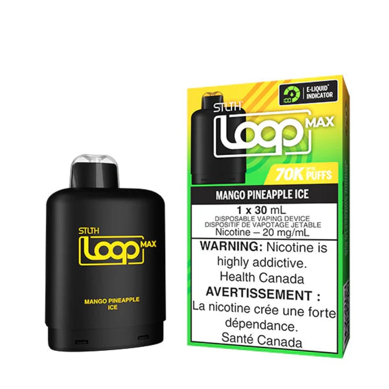 STLTH Loop MAX - Mango Pineapple Ice -Sweet mango and pineapple with a cool icy touch. STLTH Loop MAX Key Features: E-Liquid Indication with Loop Max battery Precise Airflow Control Two mode:Normal and Boost STLTH Loop MAX Specifications: Up to 70000 Puffs
