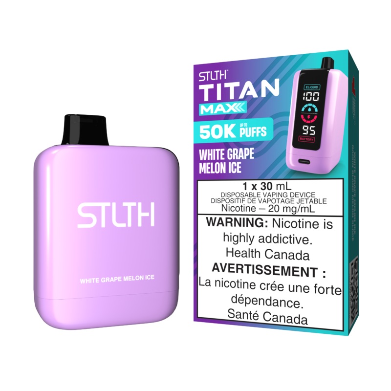 Flavour Notes: White Grape Melon Ice STLTH Titan Max Disposable Vape Specifications: Up to 50,000 puffs E-Liquid Volume: 30mL Battery Capacity: 1000mAh Rechargeable (USB C) LED Screen: Battery Level Indicator E-Liquid Level Indicator Airflow Control