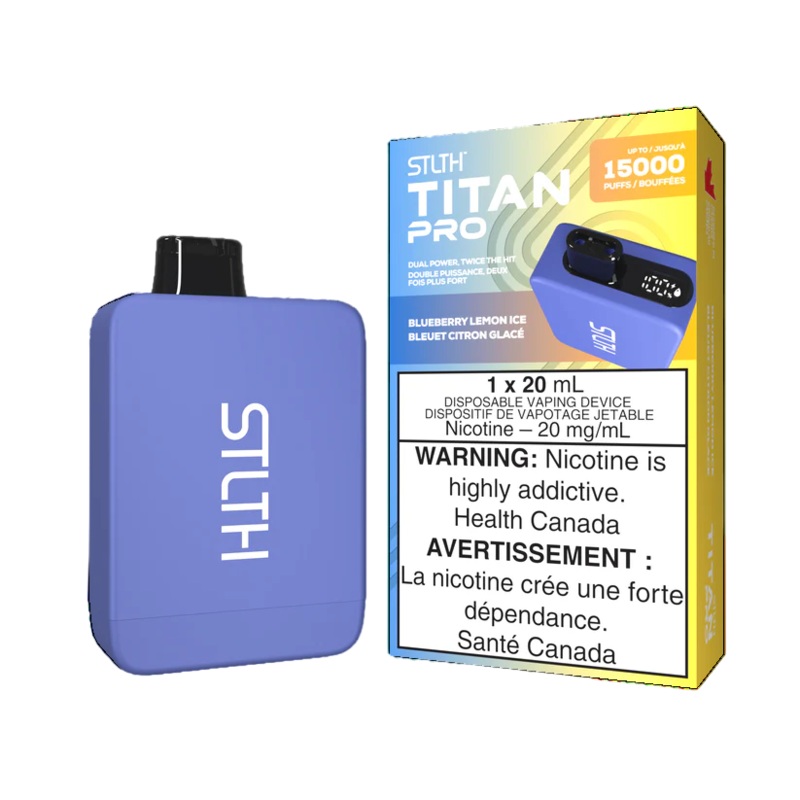 The STLTH Titan Pro 15K - Blueberry Lemon Ice - A refreshing blend of juicy blueberries, a zesty splash of squeezed lemon, and an icy finish. Features: Dual vertical mesh coils Liquid Level Indicator Battery Indicator LED screen Specifications: Up to 15,00