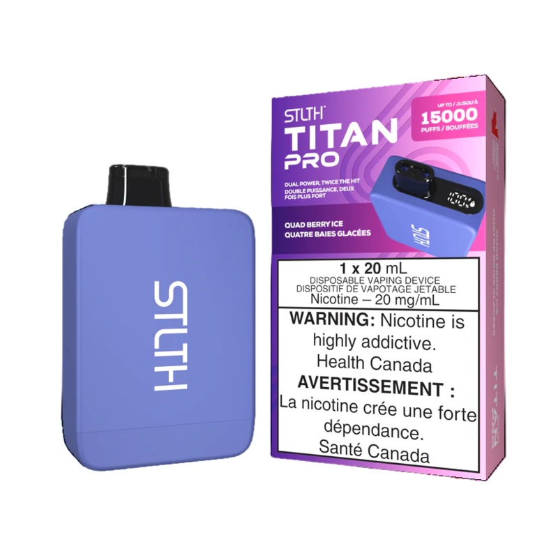The STLTH Titan Pro 15K - Quad Berry Ice - A blend of strawberries, blueberries, blackberries, and raspberries harmoniously intertwined in one berrylicious flavour finished with ice. Features: Dual vertical mesh coils Liquid Level Indicator Battery Indicat