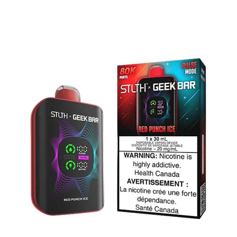 STLTH x Geek Bar - Red Punch Ice - A bold burst of mixed red fruits with a sweet punch and an icy finish. STLTH x Geek Bar Disposable Key Features: Pulse Mode: Enjoy massive vapor, bold flavor, and a vaping performance thats 200% stronger than before! Adju