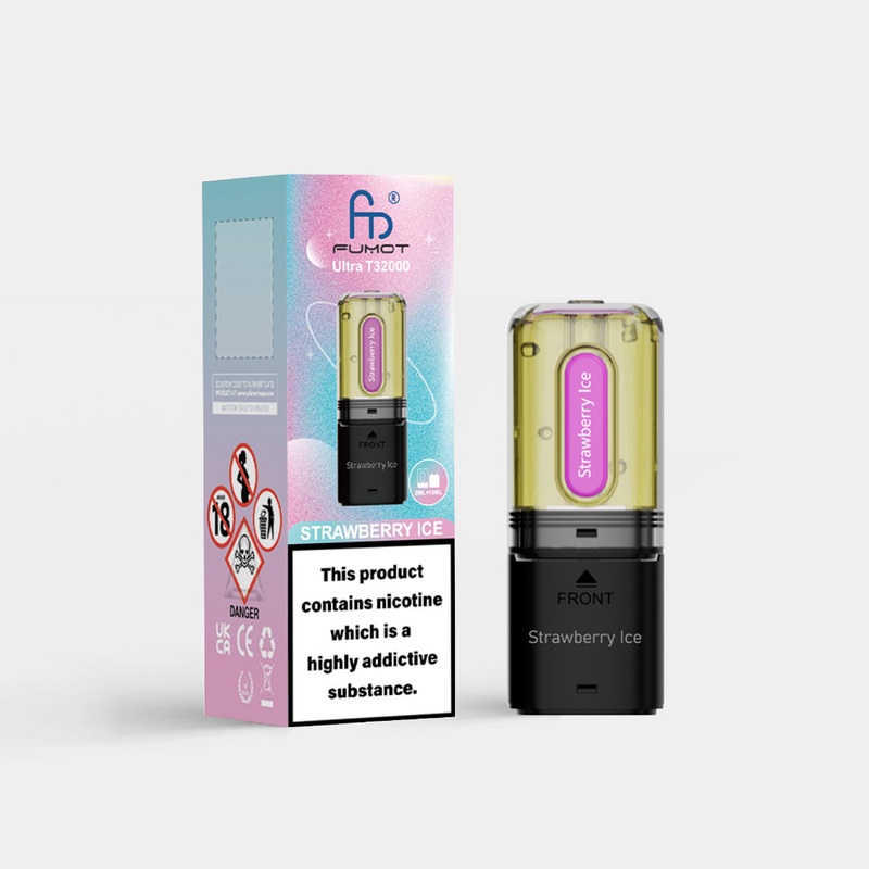Fumot Ultra T32000 Pods Strawberry Ice Enjoy up to 16,000 puffs of vibrant flavour. Each pod includes 2ml + 10ml of e-liquid, blending ripe strawberries with a subtle icy hit