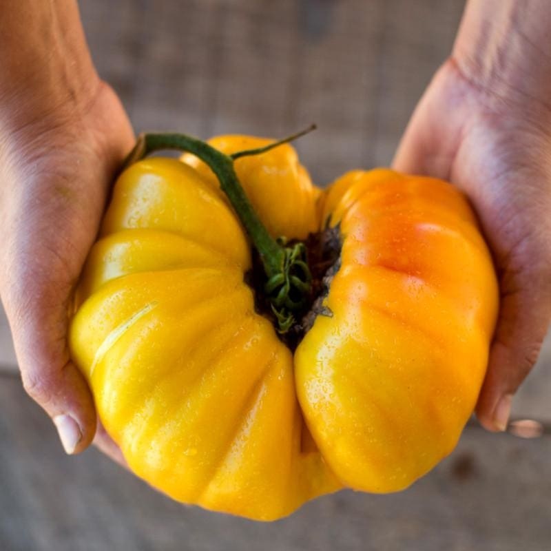 Massive fruits, our first one coming in at 1.3 pounds; with yellow-orange skin, a red starburst bottom streaking upward and inward into the silky, fruity tasting flesh. The Striped German Tomato is an incredible tomato!