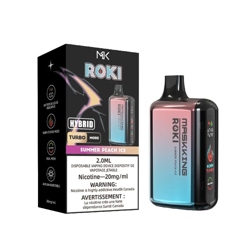MaskkingRoki 15000 Disposable Vape Flavor: Summer Peach Ice Features: Up to 15000 puffs 20mg Nicotine Strength 850 mAh Dual Mesh Coil Side Full Screen Airflow Adjustable Normal & Turbo Mode USB C Charging Port Package Includes: 1 xMaskkingRoki 15000 Dispos