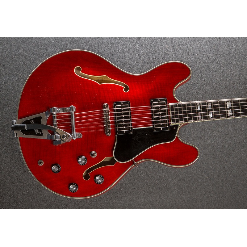 Transparent Red, Gloss finish, Semi-hollow laminated Flame Maple body with the center block, Multi-ply Ivoroid/Black binding, Bound 12 radius Ebony fingerboard with the pearl split block parallelogram inlays on a traditional even C shaped Maple neck, 24.75