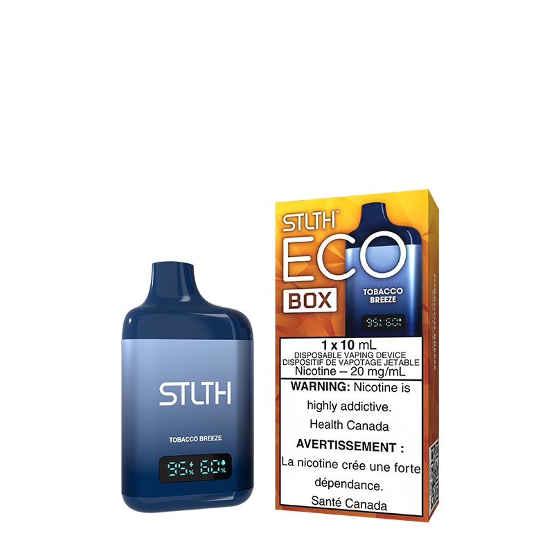 Tobacco Breeze STLTH Eco Box Disposable (Carton of 5 Units)Smooth and breezy tobacco flavor with a clean finish.______STLTH ECO BOX 1 carton contains 5Disposable Devices 10mL of E-Liquid Battery Indicator E-Liquid Indicator LED Screen MSRP Per Unit: 16.39$