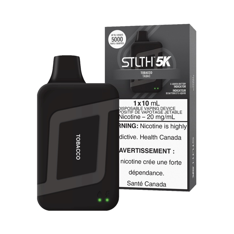Tobacco STLTH 5K DISPOSABLESmooth And Classic Tobacco For A Perfect All-Day Vape! Contains 1 Disposable Device 10mL of E-Liquid 600 mah Battery Up to 5000 Puffs Type-C Charger E-Liquid & Battery Indicator MSRP Per Unit: 25.00$ (20.00$ + 5.00$ Excise Duty)