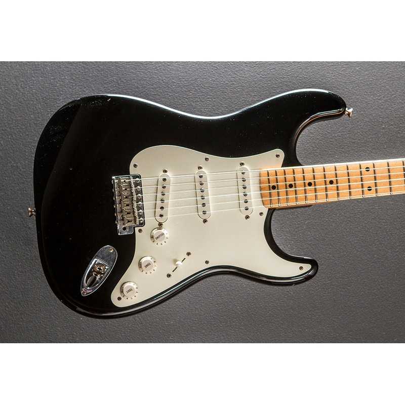 Black, Aged nitrocellulose lacquer finish, Alder body, 10/56 V shaped Maple neck with a 7.25 radius Maple fingerboard and vintage size frets, 25.5 scale length, 1 5/8th nut width, Stock unmarked Fender custom shop single coil Strat pickups, 5-way switching