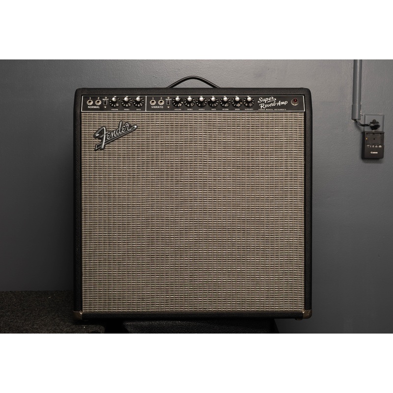 “This faithful recreation of the legendary Super Reverb of 1963-1968 is a must-have for vintage enthusiasts and Stratocaster guitar slingers, but players of all styles enjoy its shimmering tone. The 45-watt Super Reverb’s medium output and stage-filling sound make it the perfect amp to crank up for club gigs or the concert stage. Features include dual 6L6 Groove Tubes output tubes, one 5AR4 rectifier tube, four 12AX7 preamp tubes, two 12AT7 tubes, four 10″ 8-ohm Jensen P10R speakers with alnico magnets, dual channels (normal and vibrato), tube-driven Fender reverb, tube vibrato, two-button footswitch for reverb and vibrato on-off, black textured vinyl covering with silver grille cloth, and tilt-back legs.”