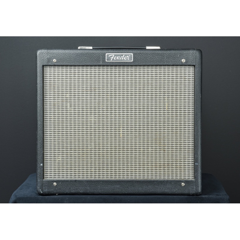 “The Blues Junior;, a warm-toned favorite, takes our 15-watt tube preamp/power amp platform and pushes it through a 12″ Fender Special Design Eminence speaker. That sound comes courtesy of a pair of EL-84 Groove Tube output tubes and three 12AX7 preamp tubes. Add our renowned Fender reverb, flexible controls, and FAT circuit with footswitch for golden tones, and you’re in business. And just look at that chrome panel, that black textured vinyl with silver grille cloth, and those vintage pointer knobs.”
