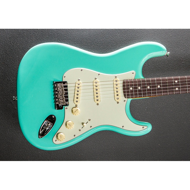 Seafoam Green with the matching headstock, Gloss urethane body finish, Alder body, Vintage style mint green pickguard, Deep C shaped Maple neck with a 9.5 radius R/osewood fingerboard and narrow tall frets, 25.5 scale length, 1 11/16th” nut width, Fender V-Mod II single coil Stratocaster pickups, 5-way switching with the master volume, tone 1. (neck/middle pickups) and tone 2. (bridge pickup) controls, The push/push on the tone 2 control activates the neck pickup in switch positions one and two adding two unique pickup configurations not normally found on a Strat, Two point synchronized tremolo with the bent steel saddles, Standard staggered cast/sealed tuners, The neck thickness is .80 at the first and .91 at the 12th frets, 8.2 pounds, With the Fender hardshell case, Excellent