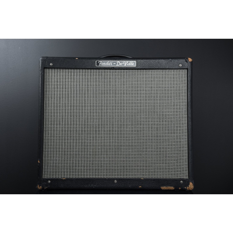 “Everything you need, and nothing you don’t! Our Hot Rod DeVille; 212 sends 60 scorching watts straight into a pair of 12″ Fender Special Design Eminence speakers, courtesy of two 6L6 Groove Tube output tubes and three 12AX7 preamp tubes. Yikes! Three channels give you a choice of “normal” (with bright switch), “drive” (with gain and master controls) and “more drive” sounds, with additional features including an FX loop, Fender long-spring reverb, external speaker jack, internal variable bias control and two-button, three-function channel select footswitch. The look is pure Fender…Chrome panel with vintage pointer knobs, plus black textured vinyl covering and silver grille cloth.”