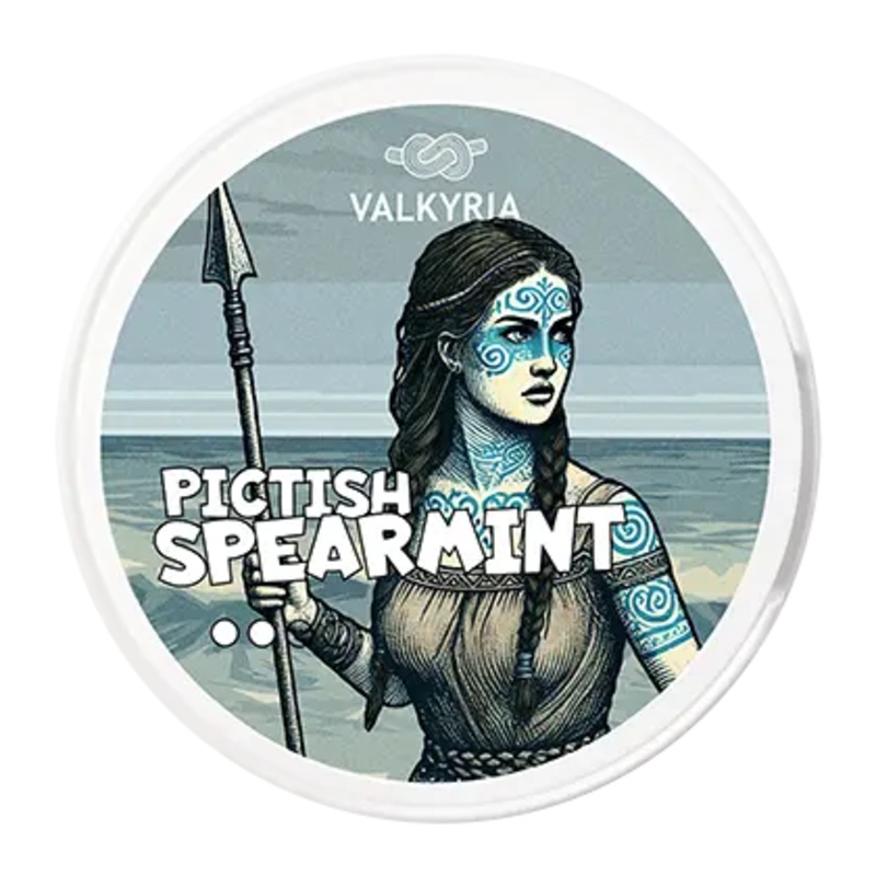 Valkyria - Pictish Spearmint (4.5mg) offers a refreshing burst of icy spearmint combined with a perfectly balanced nicotine strength, ideal for those seeking a smooth and satisfying pouch experience. Crafted for users who appreciate a cool mint flavor with
