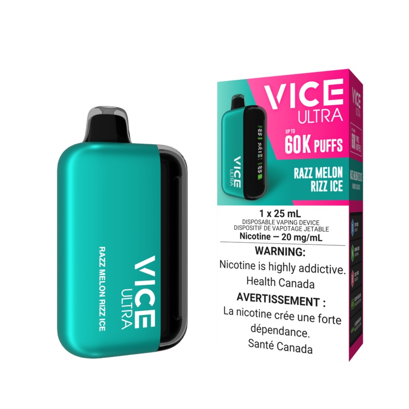Vice Ultra Specifications Up to 60,000 puffsLED Screen with Battery and E-liquid Indicators25 mL of E-Liquid20 mg/mL900 mAh Internal battery Flavour Notes: RaspberryWatermelonIce