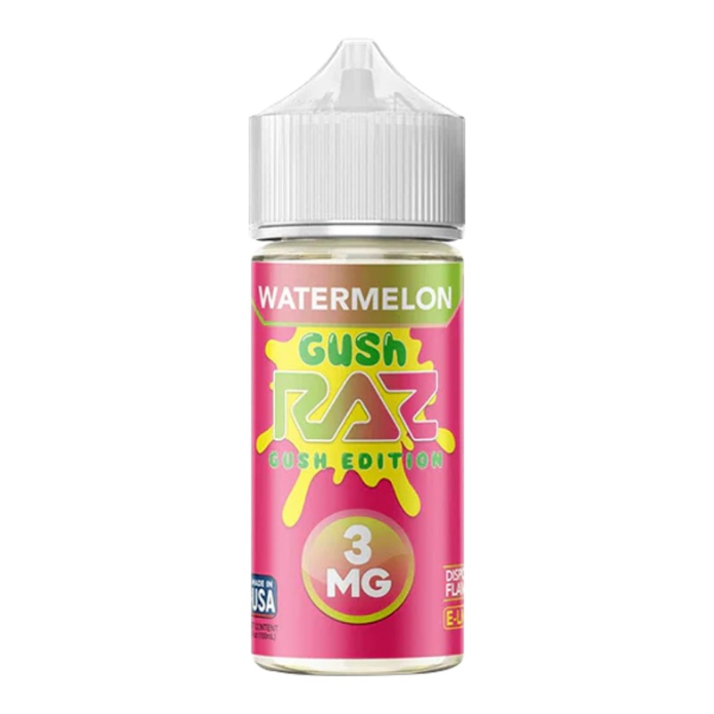 RAZ X POD JUICE GUSH EDITION Flavor:The Watermelon Gush Pod Juice 100ml Gush Edition flavor is optimized for lower-resistance pod kits and mods, with an emphasis on vapor production. E-Liquid contents: 100mL Nicotine Strengths: 3mg and 6mg Blended for use