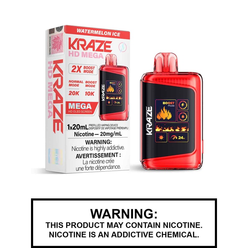 Introducing the Watermelon Ice Kraze HD Mega disposable vape, the ultimate addition to the Kraze vape family. With up to an astonishing 20000 puffs and a generous 20mL vape juice capacity, the Kraze HD Mega ensures prolonged puffs without compromise. Equipped with an 800mAh rechargeable battery and type c charging capability, this device keeps you powered up for uninterrupted vaping.