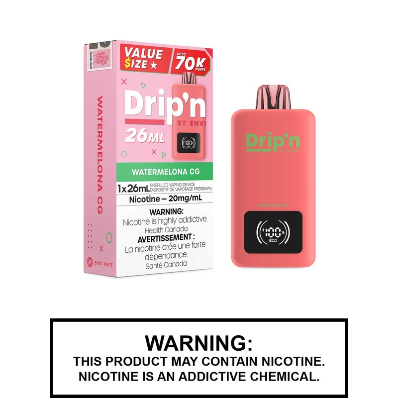 Get more out of every puff with the Watermelona CG Dripn 26mL disposable vape – a high-capacity, flavour-forward device from Dripn by Envi built for serious performance. Featuring a large 26mL vape juice capacity and up to 70,000 puffs in Eco Mode, this Dripn vape is engineered for longevity without sacrificing flavour.