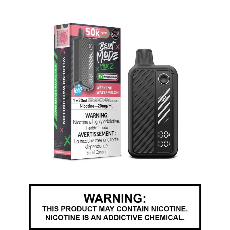 Unleash the power of the Weekend Watermelon Iced Flavour Beast Beast Mode Max 2, the latest addition to the Flavour Beast vape family. Designed to deliver an extraordinary vaping experience, this disposable vape boasts 20mL of vape juice and up to 50,000 puffs. With four unique firing modes, you decide how to enjoy your favourite Flavour Beast flavours. Whether youre in the mood for maximum puff counts or chasing dense clouds, the Beast Mode Max 2 adapts to every vibe.