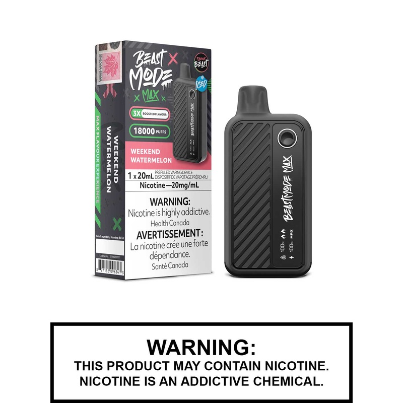 Introducing the Weekend Watermelon Iced Flavour Beast Beast Mode Max disposable vape, the latest addition to the Flavour Beast family! With an impressive 20mL vape juice capacity and up to 18,000 puffs, the Beast Mode Max vape redefines longevity and satisfaction. Choose from three dynamic firing modes Standard, Beast Mode, and Max Mode to customize your vaping experience to your style.