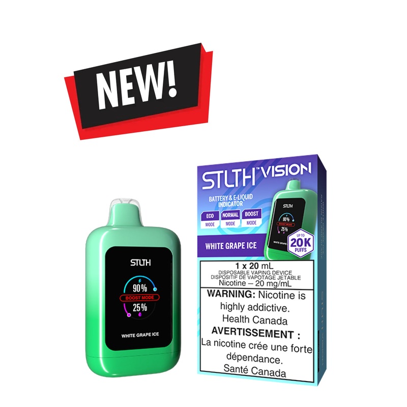 White Grape Ice STLTH Vision Disposable Experience pure delight as you succumb to irresistible white grapes, enhanced by a refreshing and invigorating ice sensation______STLTH VISION 1 carton contains 1 Disposable Devices Dynamic Screen 3 Modes - ECO - NOR