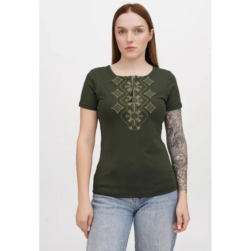 Women's short-sleeved khaki embroidered shirt (no embroidery on sleeves) The classic t-shirt is made of pleasant tricot, decorated with geometric embroidery. Until recently, the color khaki was associated exclusively with military clothing. But today it oc